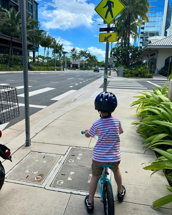 青空が広がるハワイの街で、ボーダー柄のTシャツ姿の長男の禅清くん(4)が、ヘルメットをかぶり自転車に乗る様子を見ることができます。