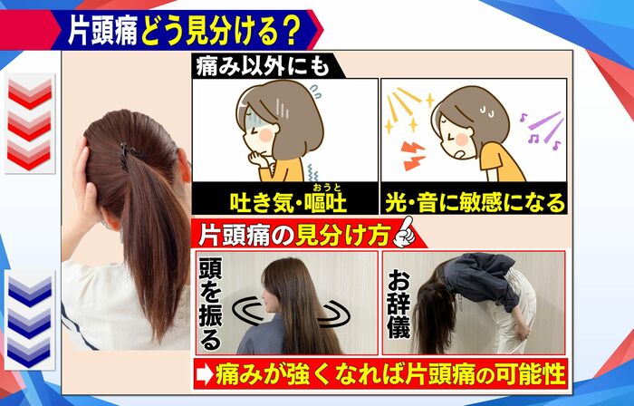下畑さんによると「頭を振ったりお辞儀をするなど、体を動かしてみて痛みが増したら片頭痛の可能性が高い」ということです。