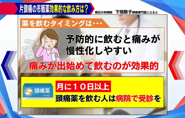 下畑さんによると、薬を飲むタイミングは予防的に飲むと痛みが慢性化しやすいため、痛みが出始めて飲むのが効果的だといいます。頭痛薬を月に10日以上飲む人は病院で受診をした方がいいということです。