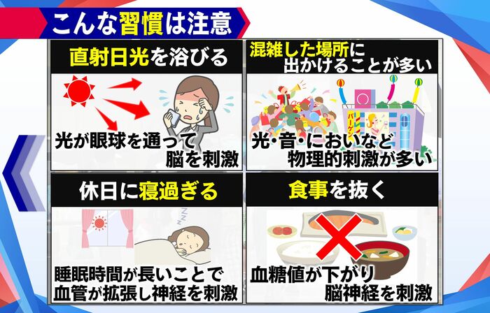 片頭痛の原因やメカニズムは諸説ありますが、引き金になるのは、ストレス・月経・睡眠不足・疲れ・食事を抜く・気圧・温度差・におい・音・強い光など、さまざまあると考えられています。