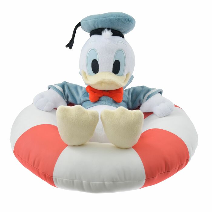 浮き輪に乗ってくつろぐドナルドダッククールクッションはぱっと目を引く存在感!