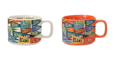 シンプルな形状のスタッキングマグに、スタバ×BEAMSコラボのペナントロゴデザインを施しました。同じペナントロゴデザインを使用したマルチケースやバンダナ、スローケットなどとの組み合わせも相性抜群で、リサイクルセラミックを使用し環境にも配慮しています。