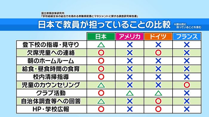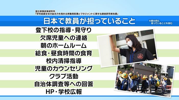一方で日本の教員に課せられている「仕事」は、「授業」だけでなく「カウンセリング」「広報」など多岐に渡り、欧米と比較すると格段に多いことが問題となっています。