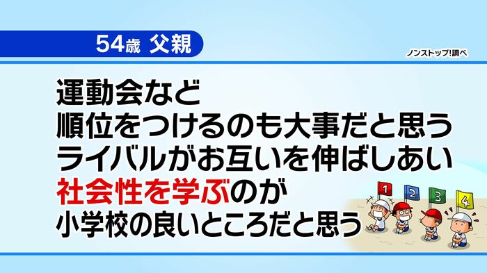 視聴者の54歳男性からは、「運動会で順位を付けないことが増えているが、ライバルと競い合う中で社会性を学ぶのも大事なのでは?」という意見も寄せられました。