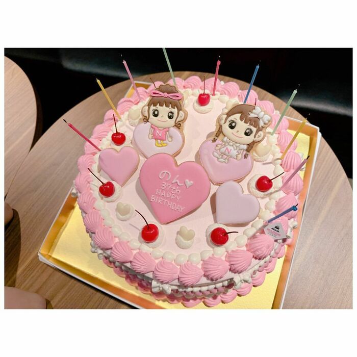 ピンクカラーのケーキには、「のん 37th HAPPY BIRTHDAY」と書かれてたハート型のクッキーに、辻さんをイメージしたと思われる三つ編みやお団子姿の女の子が描かれたクッキーもトッピングされていました。