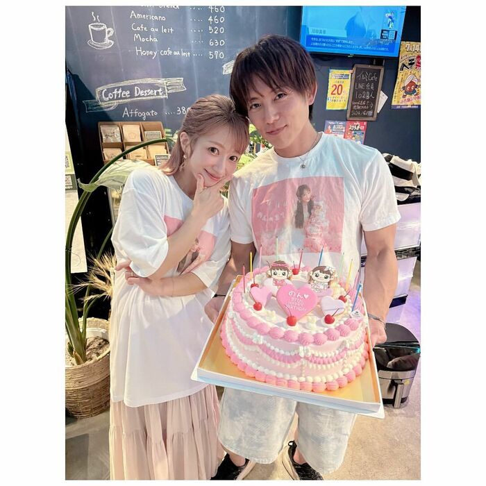 さらに、誕生日ケーキを持った杉浦さんと肩を寄せ合い、小顔ポーズをした姿も公開しています。