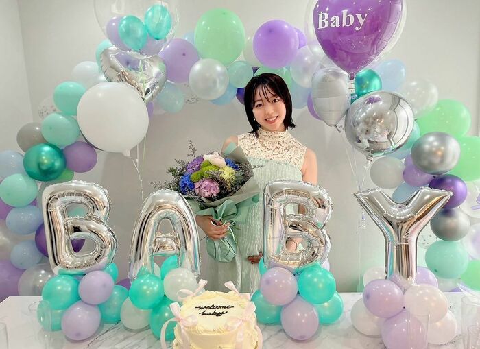 投稿された写真には、緑や紫の風船のデコレーションに囲まれながら、ふっくらとしたおなかを抱えた峯岸さんが!