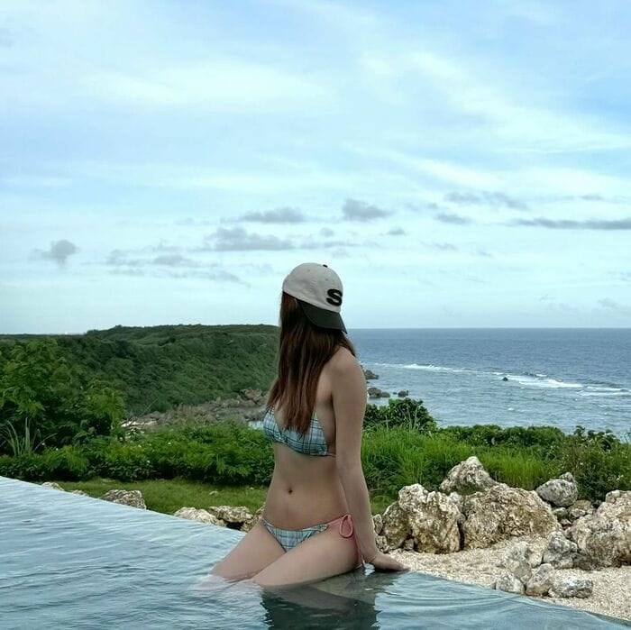 海をバックにプールサイドに座る中町さんの姿が公開されています。