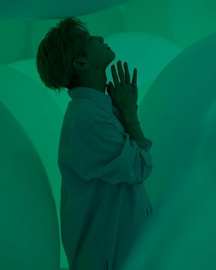緑に光る空間に両手を合わせ上を向く写真などが公開されています。