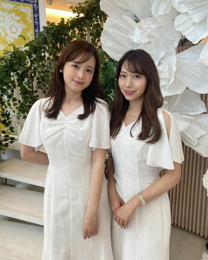 その他にも、大きな白い花のオブジェをバックに、白地にドット柄の上品なワンピースで小野寺さんとの“おそろいショット”も披露した久慈さん。
