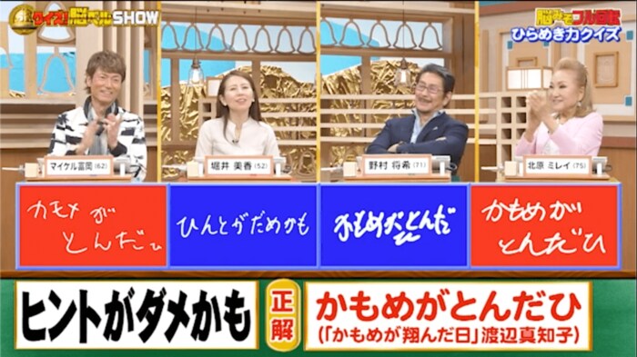 堀井美香さんは『ひんとがだめかも』、野村将希さんは『かもめがひとんだ』と回答して不正解。マイケル富岡さん、北原レイさんが正解でした。