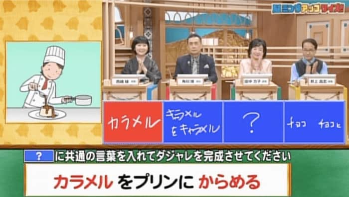 角川博さんは「キャラメルをキャラメル」と回答。惜しいですが不正解。西崎緑さんだけが正解でした。