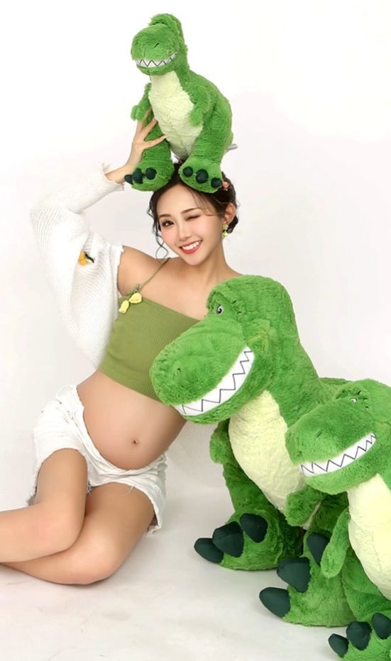 さらに、恐竜のぬいぐるみを持ち、大きく膨らんだおなかが際立つショットも公開されています。