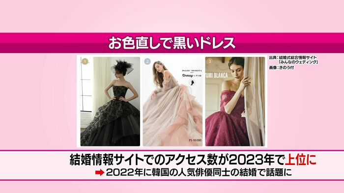 流行のきっかけとなったのは、2022年に俳優のチェ・テジュンさんと結婚したパク・シネさんが、結婚式の前撮りで黒いドレスを着用したことから。2023年には、結婚情報サイトでアクセス数が上位にランキングしました。