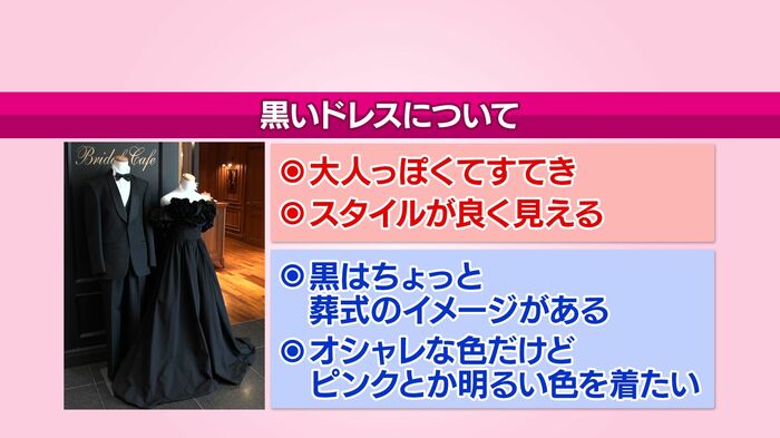 まず紹介されたのは、ウェディングにおける最近のカラードレスの流行色の話題です。以前は赤やピンク、青などが人気でしたが、最近は黒いドレスが人気だといいます。