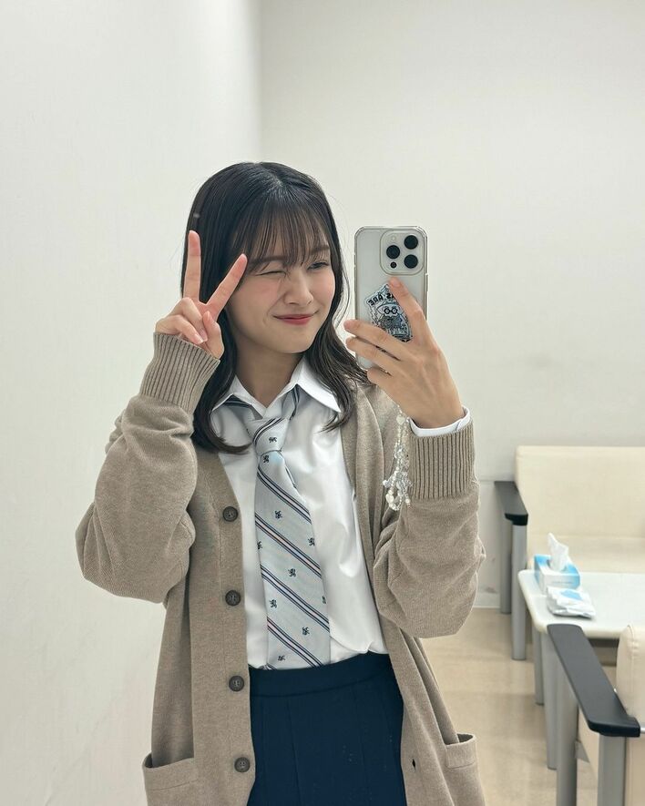 原田アナは、淡い水色のネクタイにベージュのカーディガンを羽織った制服姿に変身。鏡を前に、ウインクとピースであざとかわいい自撮りショットを披露しました。