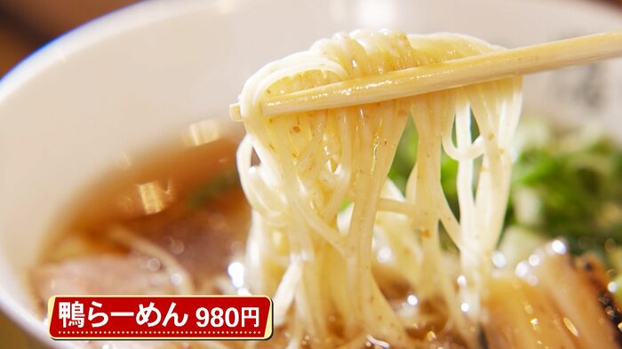 こちらの「鴨らーめん」、出汁は合鴨とネギと水のみ。麺はスープと絡む特注の細麺なんです!