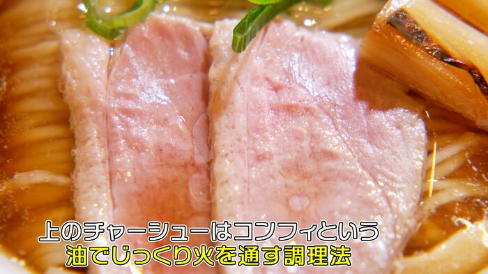 さらに上にのっている鴨のチャーシューは「コンフィ」と呼ばれる脂の中でじっくり火を通していく調理法で作っているため、しっとりな仕上がりに。