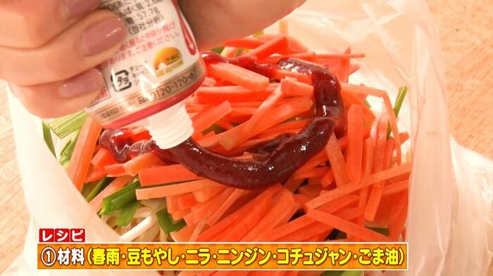 耐熱のポリ袋に春雨、豆もやし、ニラ、ニンジン、コチュジャン、ごま油を入れる