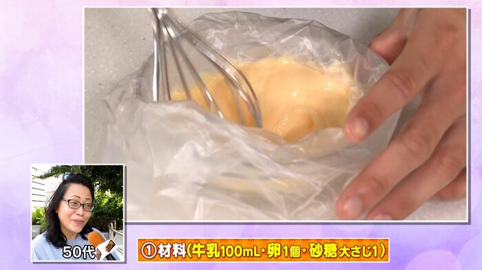 牛乳(100mL)、卵(1個)、砂糖(大さじ1)を耐熱ポリ袋に入れてよく混ぜる