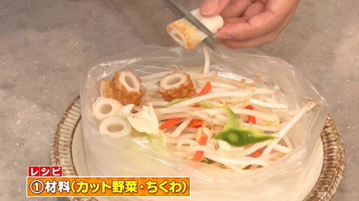 ちくわをキッチンバサミで一口大に切って、カット野菜と一緒に耐熱ポリ袋の中に入れる