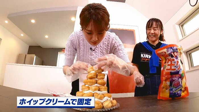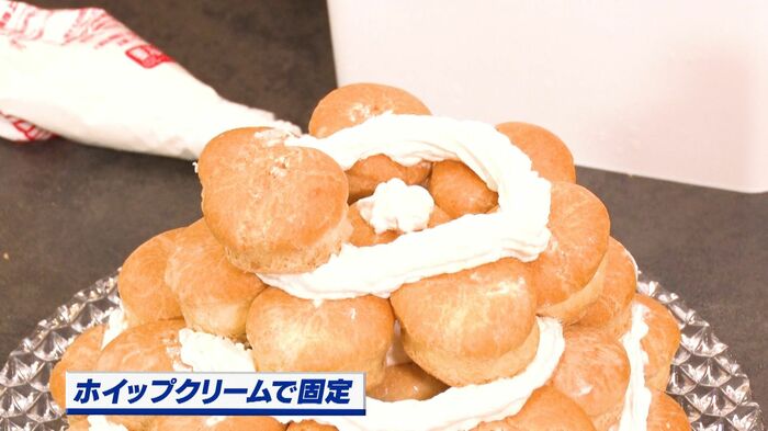 シュークリームが落ちないようにホイップクリームで固定しながら積み上げていきます。