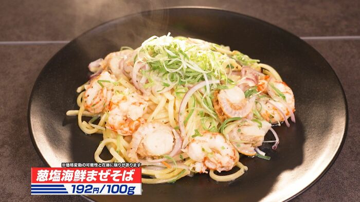 続いては、レンチンだけで簡単に食べられる絶品ネギ塩海鮮混ぜそば。塩味ベースなので大人から子どもまで楽しめます!