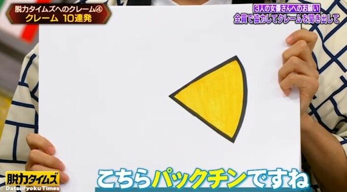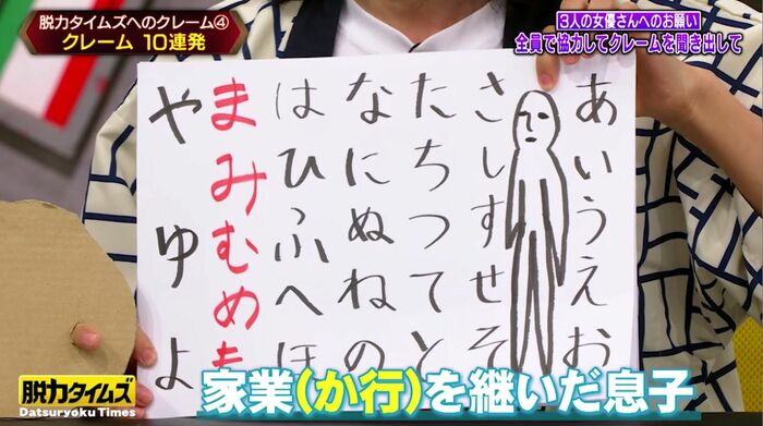 フリップでは、“パックマンのオス”といって「パックチン」のイラストを披露したり、ひらがな五十音表の「か行」が人間になっている=「家業(か行)を継いだ息子」を紹介するなど、独特の手法でクレーム(?)を連発。