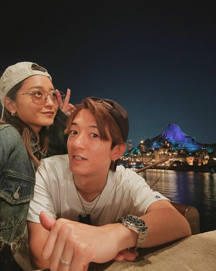夜はサングラス姿でディズニーシーのシンボル「プロメテウス火山」が見える水辺をバックに大倉さんとの2ショットを公開しました。