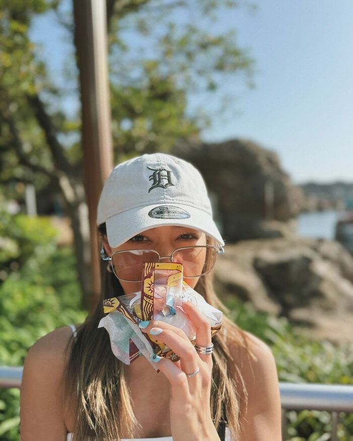 ディズニーシーの大人気フード「うきわまん」を頬張る姿などを見せたみちょぱさん。