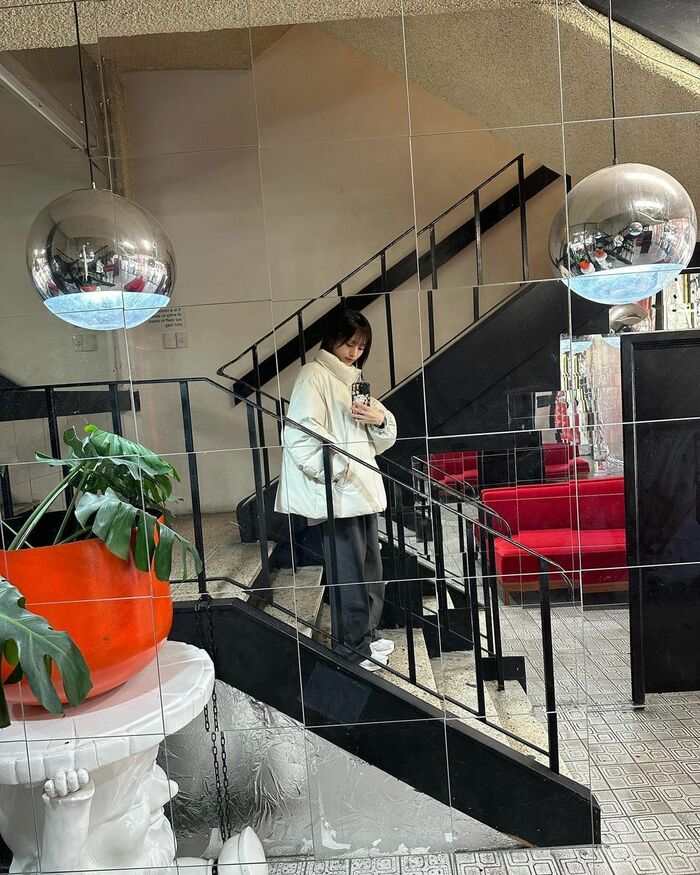 鏡越しにポーズを決める自撮りショットも。オーストラリアは現在冬のため、オーバーサイズな白いダウンをかっこよく着こなす「冬モード」な山本さんの姿も見られました。