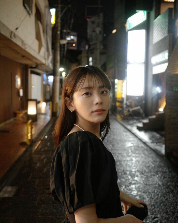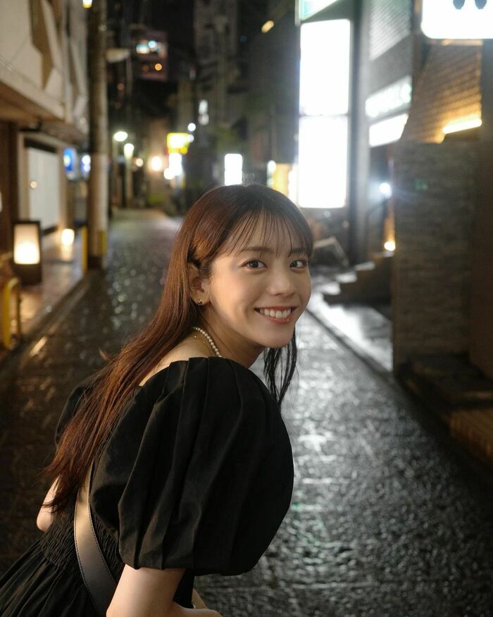 投稿された写真には、黒い服にパールのネックレスを付けた貴島さんが夜の福岡の街で振り向く様子や…。