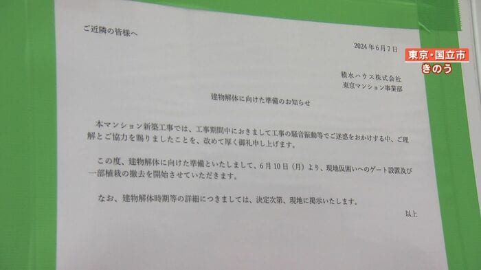 東京都国立市で、完成間近の10階建てマンションが急きょ解体されることになりました。