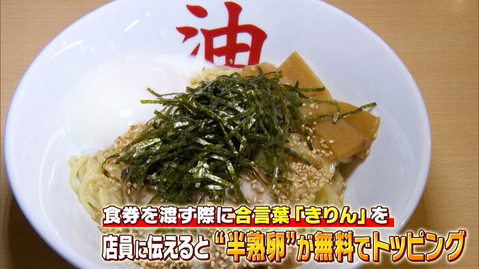 萩原さんのおすすめは、名物の「油そば」(800円)。食券を渡す際に合言葉の「きりん」を店員に伝えると、“半熟卵”が無料でトッピングされます。