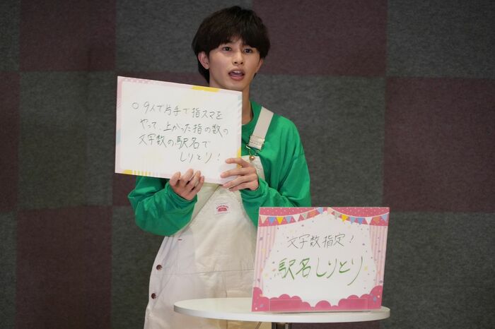 タクヤさんが考えてきたのは「文字数指定!駅名しりとり」。答える文字数が都度指定された状態で、駅名のしりとりを行うというルールを聞いたメンバーたちは「“9文字”とかになったらやばい!」(シューヤさん)とそわそわ。すると発案者のタクヤさん自身も「このゲームはだいぶ難しいと思うので、もし無理だったら…」と代替案を打ち出して…。しかし、ゲームが始まるとメンバーたちは大白熱!リョウガさんが「なんでだよ!」ブチギレる(?)場面も。