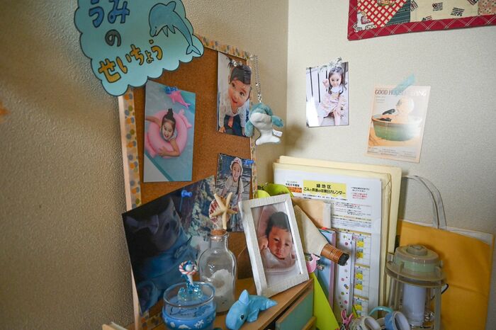 海が赤ちゃんだった頃や、少し大きくなって公園の遊具やプールで遊ぶ写真が掲示されています。また、イルカの置き物やキーホールダー、貝がらなど“海らしい”アイテムも。
