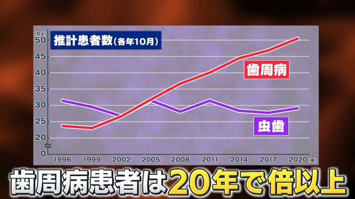 歯周病の患者数は、虫歯に比べこの20年で右肩上がりに増え続け、倍以上に膨れ上がっているのです。