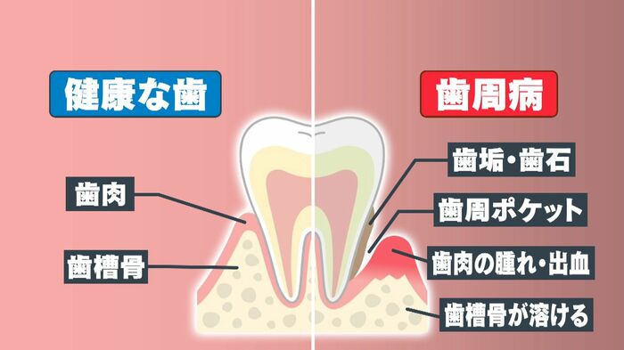 実は、命にかかわる病気につながるリスクがある「歯周病」。歯と歯茎の間にたまった歯垢の中に 「歯周病菌」が大量にすみ着き、歯肉や骨を破壊していく病気です。