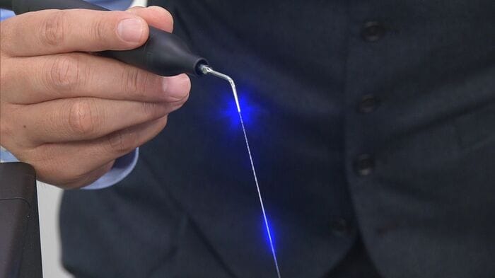 超音波で振動させながら、青いレーザーを照射。歯垢だけでなく、歯周病の原因である細菌を99.99%死滅させることができるといいます。
