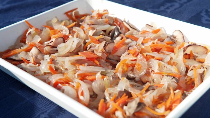 その上に繊維に沿って薄切りにした玉ねぎの層を作り、その上に千切りしたにんじんの層を重ねます。