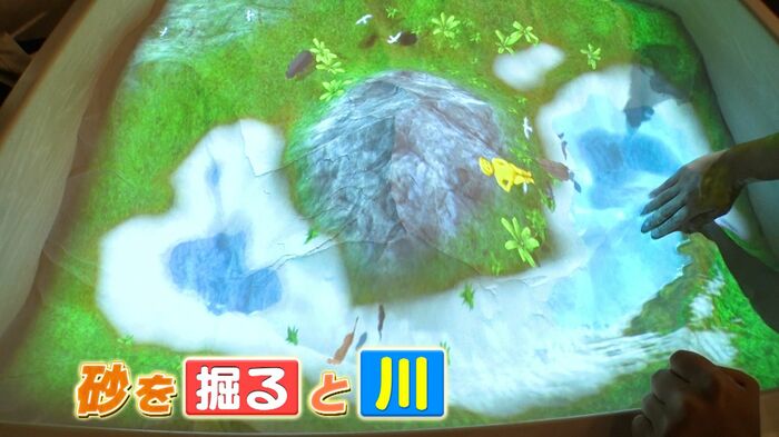 このプロジェクションマッピング、砂を盛ると山になり、逆に砂を掘ると川など水辺ができ、大自然の地形を自由自在に作ることができるんです。