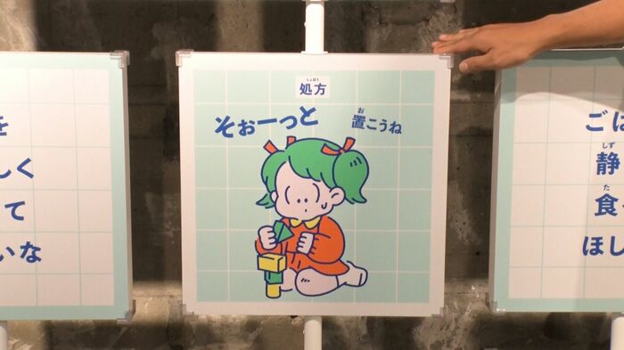 “オノマトぺ”とは、「ニャーニャー」「ワクワク」といった擬音語・擬態語のことで、この展示会では、子供とのコミュニケーションに役立つオノマトペを紹介しています。