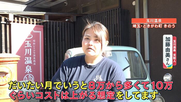 灯油を使ってボイラーで温めてお客さまに提供していまして、値上げするっていう形で聞いておりますので、だいたい月で言うと8万から多くて10万ぐらいコストは上がる想定をしてます。