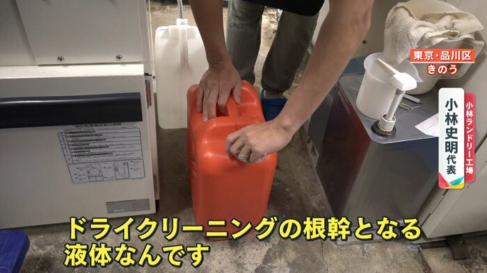 石油系溶剤といって、ドライクリーニングの根幹となる液体なんです。洋服をつるすハンガーもプラスチックハンガーで石油由来。仕上がった包装ですよね、ほこりよけの。石油由来でできているプラスチックのものがすごく多いですよね。クリーニング屋は石油製品に囲まれている職種だと思うんです。