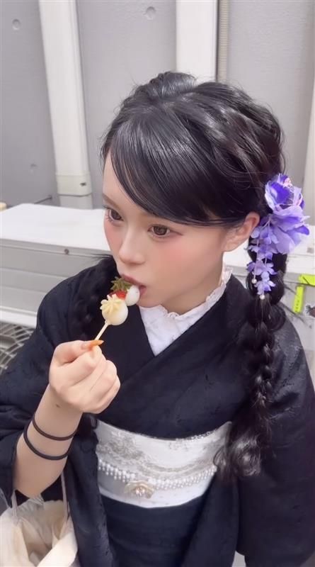 また、黒のシックなレース地の着物姿で、紫色の髪飾りをつけた三つ編みヘアを披露しています。