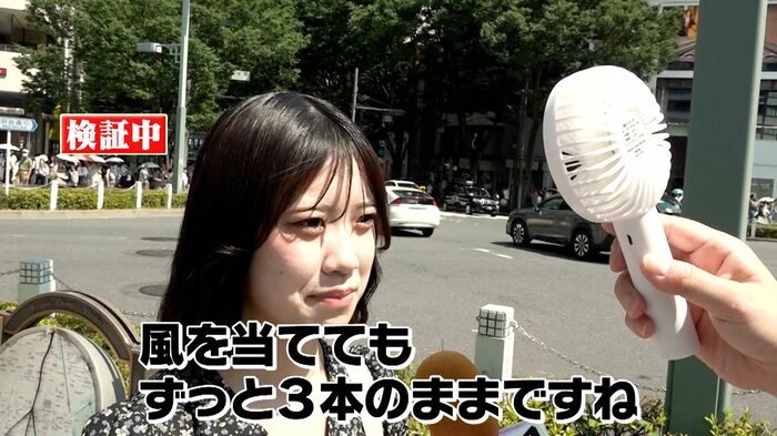 ガッチリ固定しているという高校生の“3本前髪”に、小型扇風機で風を当てさせていただくと…