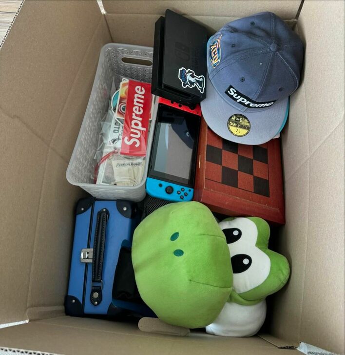 息子がカリフォルニアに持っていくとした段ボールの中には、帽子やNintendo Switch、「マリオシリーズ」の人気キャラクター「ヨッシー」のぬいぐるみが入っていました。
