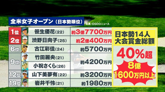 渋野日向子選手(25)も2位と大躍進し、TOP10に5人も食い込むなど、日本勢が獲得した賞金総額は8億1600万円以上にのぼります。