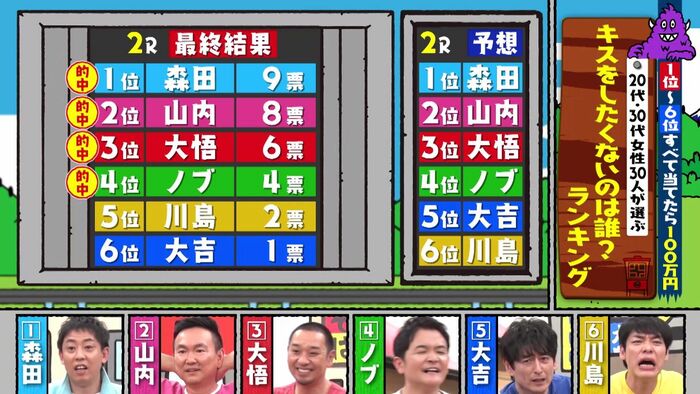5位の川島さんと6位の大吉さんだけが逆という惜しい結果に、一同は「うわー!」と絶叫。