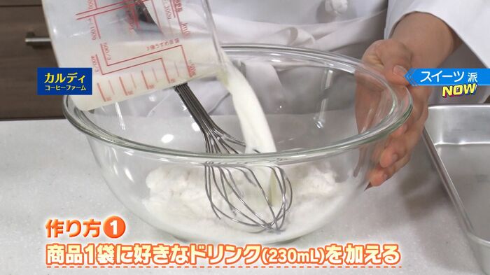 商品1袋に好きなドリンク(230mL)を加えます。大西さんは牛乳をチョイス。
